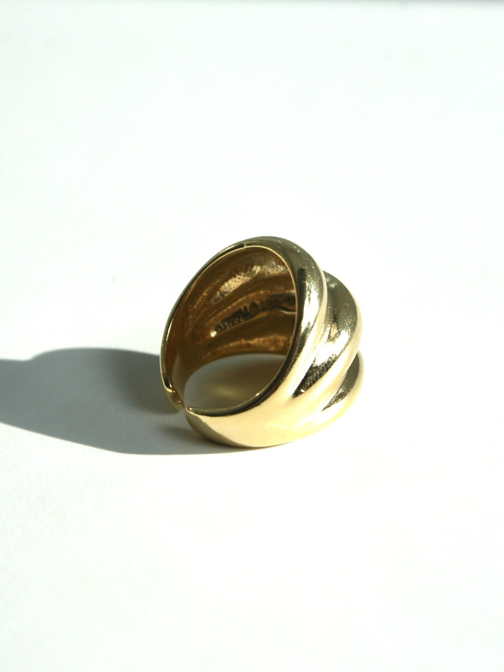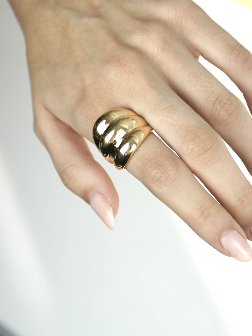 Moderno e elegante, este anel se destaca pelo seu design volumoso em camadas esculpidas, trazendo sofisticação e presença ao visual. Produzido em metal de alta qualidade com banho de ouro 18k, possui acabamento polido e brilho intenso que valoriza ainda mais a peça.