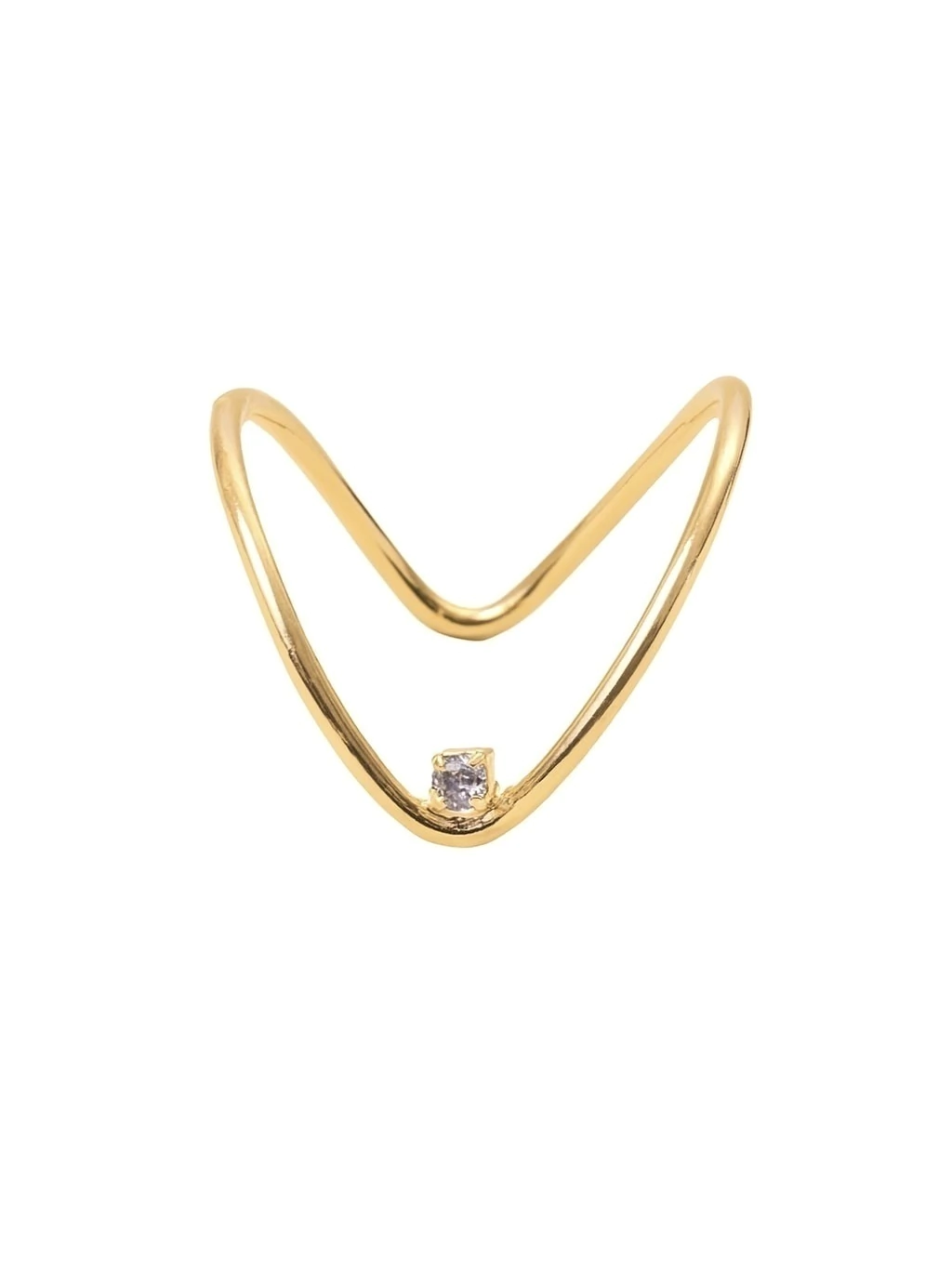 Anel delicado em formato V aberto, banhado a ouro 18k, com design minimalista e moderno. Sua estrutura leve e elegante realça a sofisticação, enquanto a zircônia brilhante no centro adiciona um toque de luminosidade discreta. Uma peça versátil, que pode ser usada sozinha para um visual clean ou em combinação com outros acessórios, criando composições estilosas e atuais.