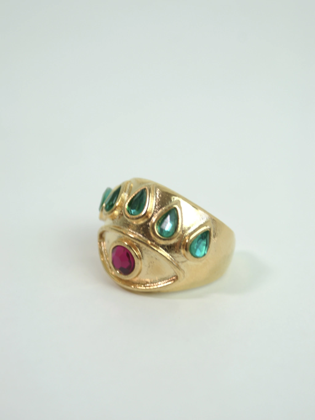Apresentamos o Anel Maya, uma peça deslumbrante que reflete a união perfeita entre elegância e proteção. Com um delicado banho em ouro 18k, este anel é adornado com um encantador olho grego verde e pedras vermelhas, criando um contraste vibrante que simboliza força e beleza.