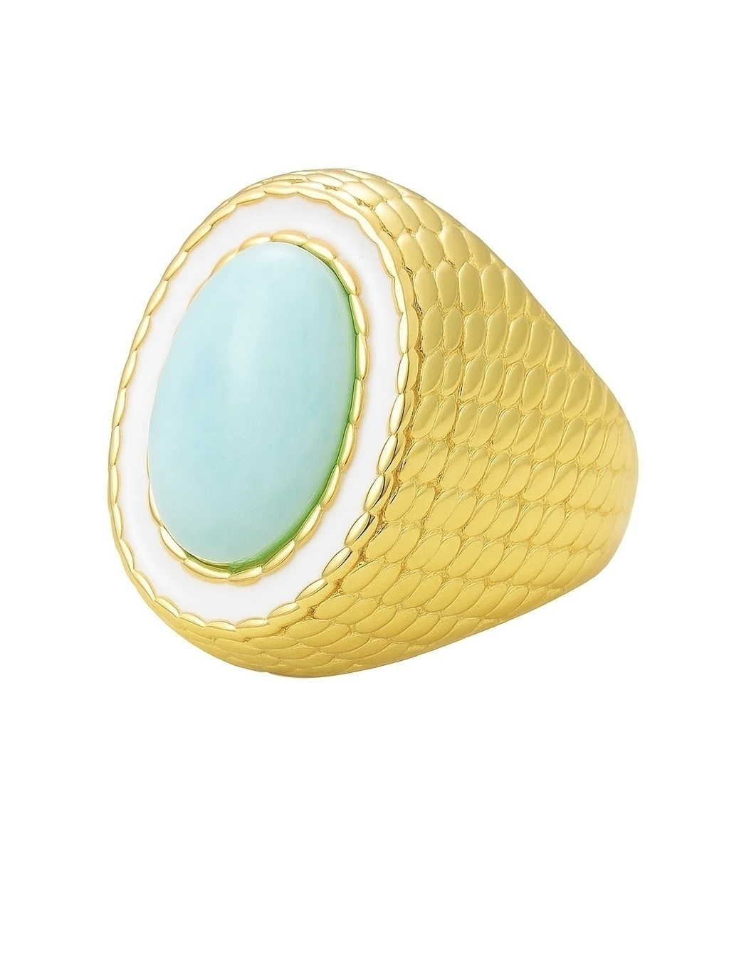 Seu design robusto com textura trabalhada lembra escamas delicadas e traz acabamento em esmalte branco ao redor da pedra, criando um contraste sofisticado. Por ser regulável, se adapta facilmente a diferentes tamanhos de dedo, oferecendo conforto e ajuste perfeito.