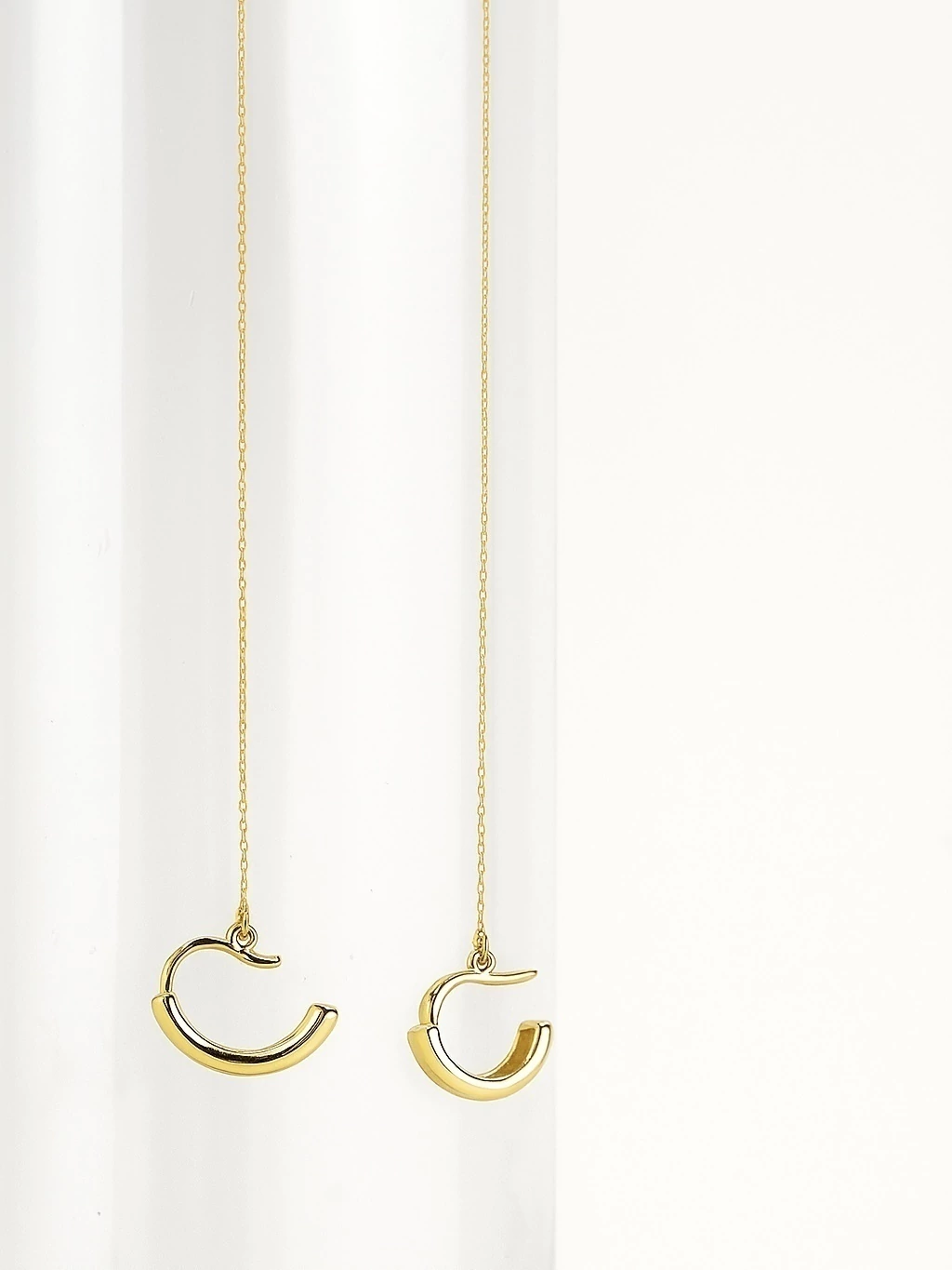 O destaque da peça é o efeito de movimento, com um fio fino e longo que termina em uma argola bold de formato geométrico arredondado. Disponível em duas versões de cor: prata e dourado.