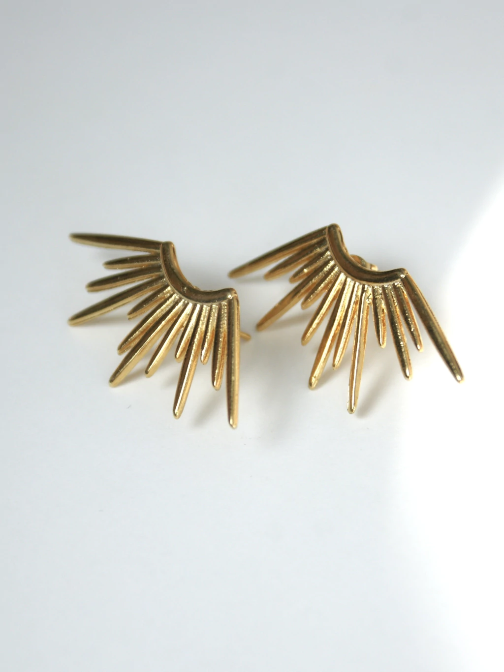 Imponente e moderno, este brinco traz um design inspirado em raios de sol/asa estilizada, ideal para quem busca uma peça marcante e cheia de personalidade. Produzido em metal de alta qualidade e banhado a ouro 18k, possui acabamento polido que reflete sofisticação e brilho intenso.
