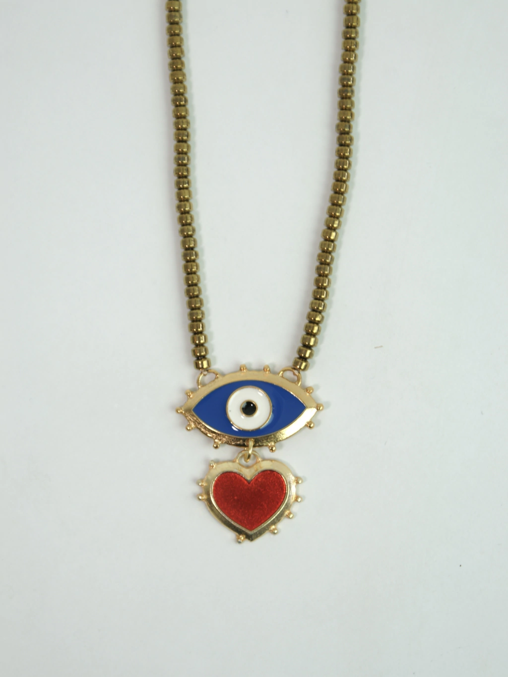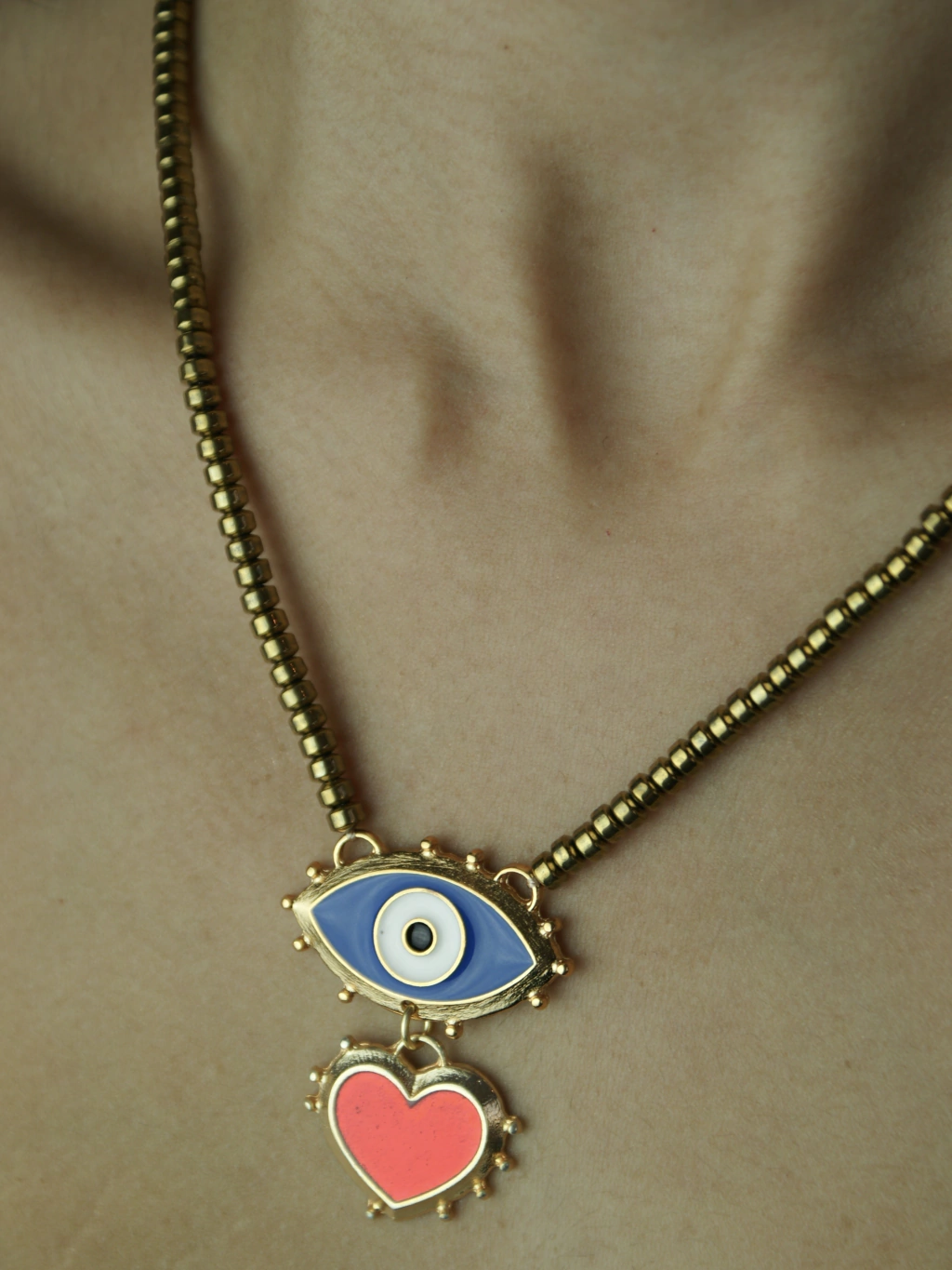 Apresentamos o Colar Aurea, uma joia que exala elegância e significado. Composto por hematita de alta qualidade, este colar é adornado com pingentes banhados a ouro 18k em formatos encantadores de olho grego e coração, trazendo proteção e amor a quem o usa.