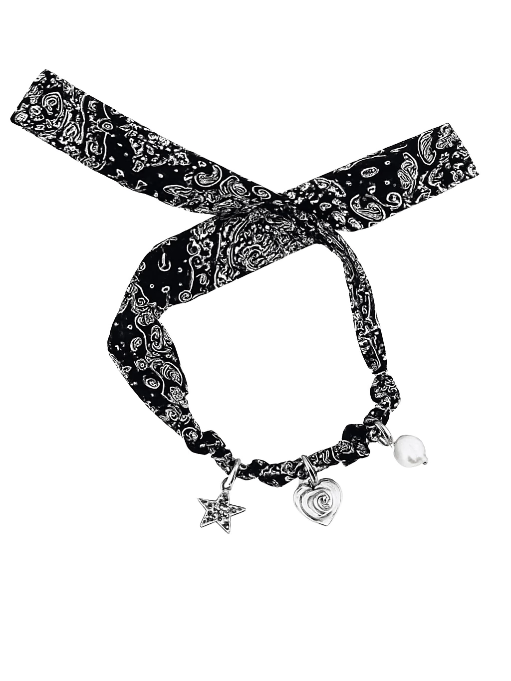 Nosso colar com faixa estilo bandana traz personalidade para qualquer look. Feito em tecido macio com estampa paisley clássica em preto e branco, ele combina o mood street com detalhes sofisticados: pingentes dourados de estrela e coração com lua, além de uma charmosa pérola natural.