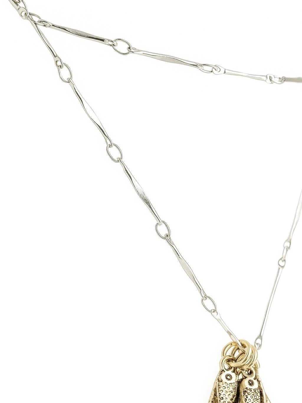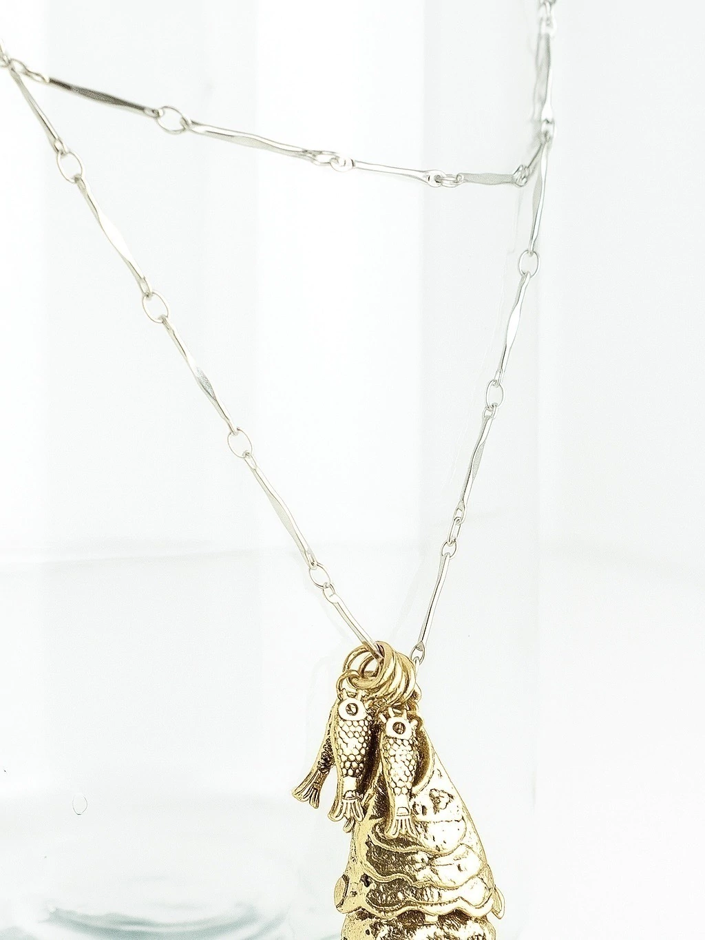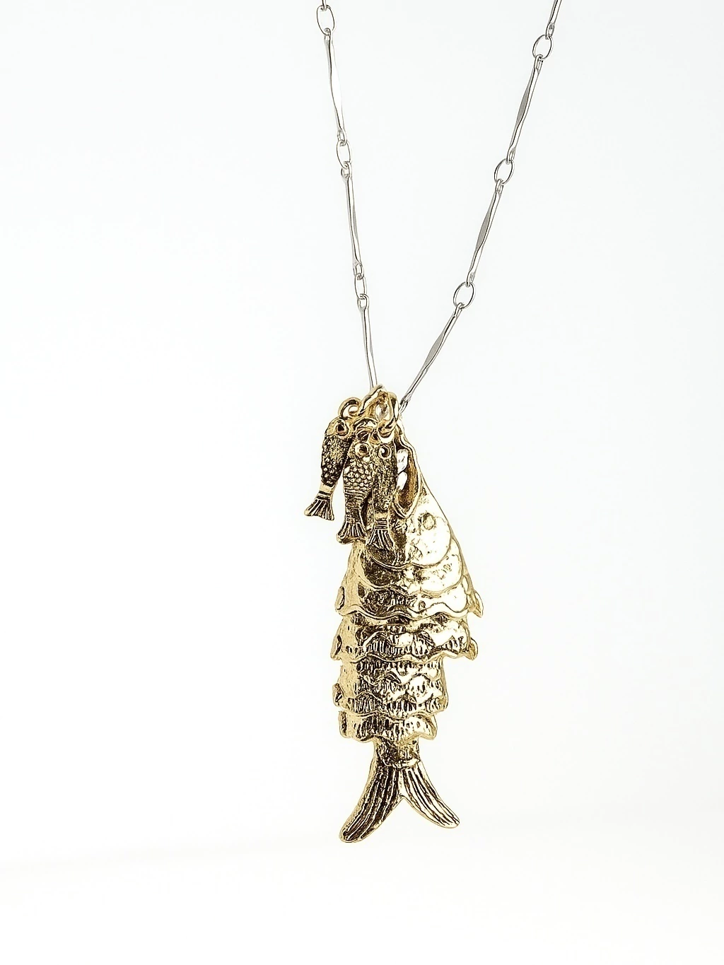 É uma peça com design original e cheio de personalidade. Com corrente alongada de elos finos e levemente torcidos, o destaque fica por conta do pingente dourado com múltiplos peixes sobrepostos, criando um efeito de movimento e textura super interessante.
