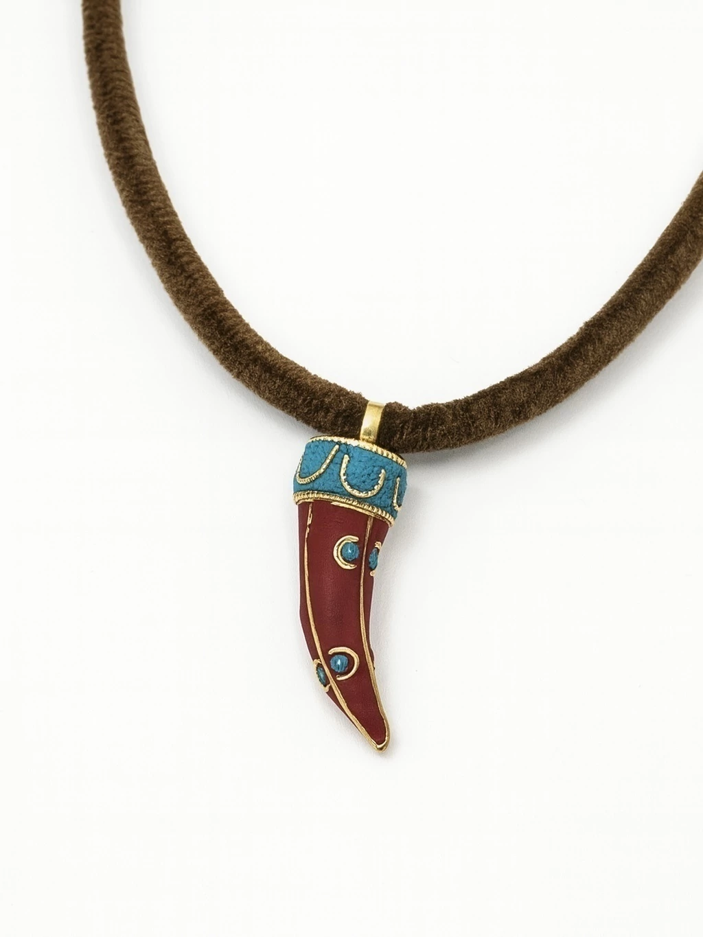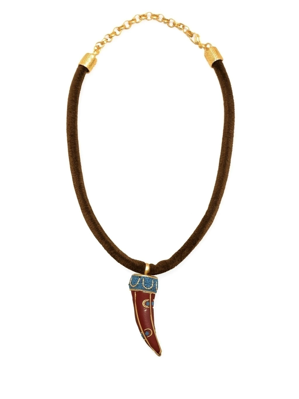 Colar artesanal com design exclusivo, composto por corrente ajustável em tom dourado, cordão revestido em tecido marrom e pingente em formato de dente estilizado. O pingente apresenta acabamento esmaltado em vermelho profundo com detalhes em dourado e azul turquesa, trazendo um ar étnico e sofisticado à peça.