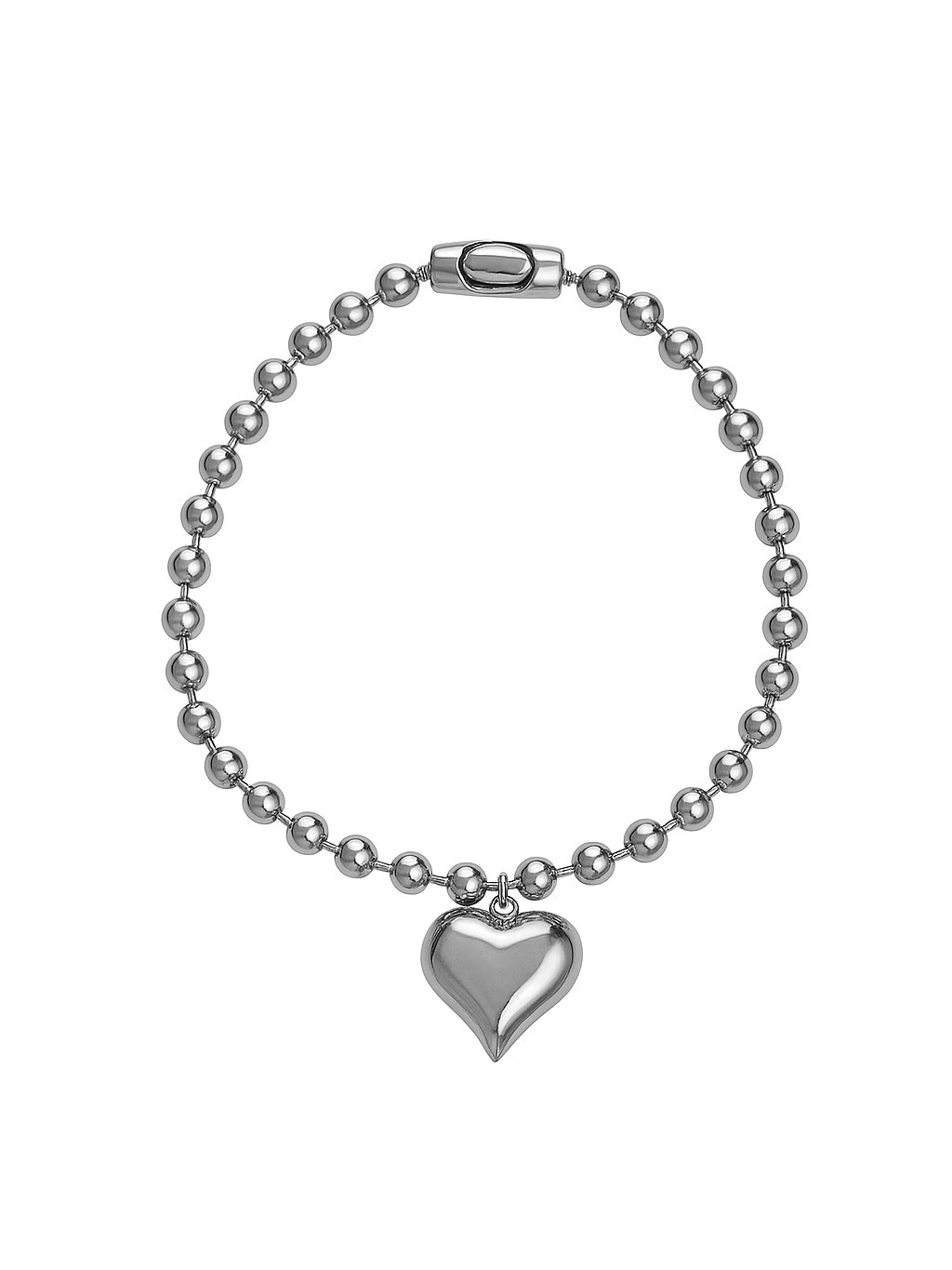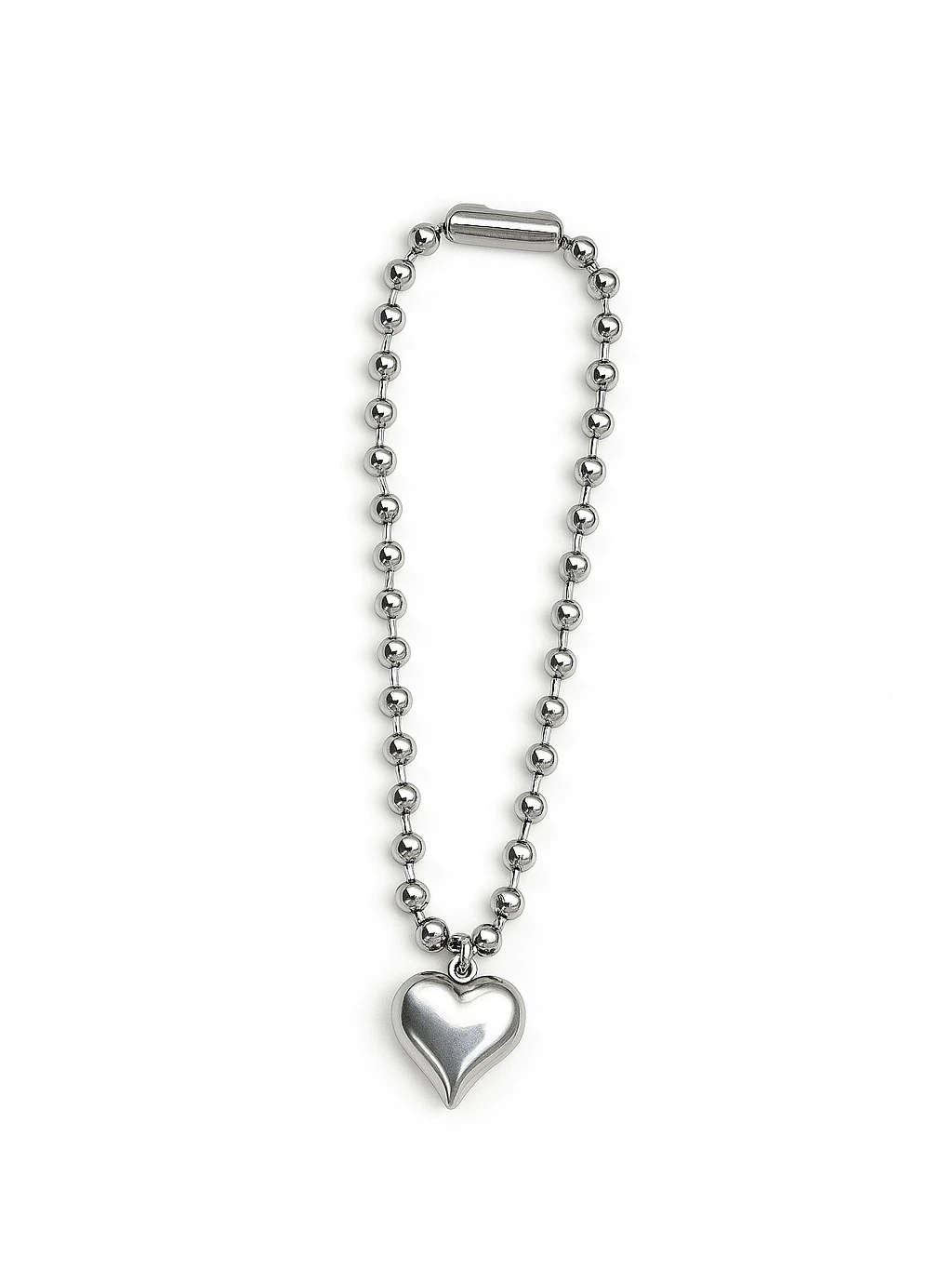 A corrente de bolinhas metálicas traz textura e presença, enquanto o pingente de coração liso e polido dá o charme final à peça. O fecho é prático e seguro.